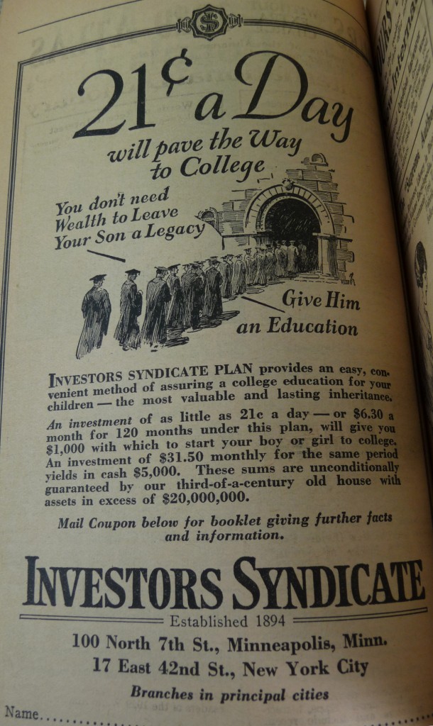 People today complain about the high cost of saving for a college education.  21 cents a day sounds like a reasonable sum to sock away. I wonder how the people who invested in  Investors Syndicate fared during the Great Depression? They are still in business today under the name Ameriprise.