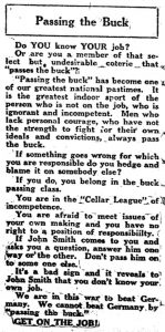 The Tribune reprinted a whole page from the San Antonio, TX based Kelly Field military newspaper. The U.S. army air training took place there. Patriotic articles, cartoons, poems and editorials filled its pages. This one editorial asks – do you take responsibility or do you pass the buck?  The writer claims, “Passing the buck has become one of our great national pastimes.” Today’s politicians should read this short piece.