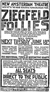 Once the Great White Way put on shows primarily geared for New Yorkers, not tourists. If you wanted to see the most dazzling show on the Broadway, The Ziegfeld Follies for 1918 would be opening in a couple of days on June 20. Where else could you see the biggest stars of the day plus dozens of beautiful, barely clad “Ziegfeld Girls”? Only at The New Amsterdam Theatre on 42nd Street this ad announced.