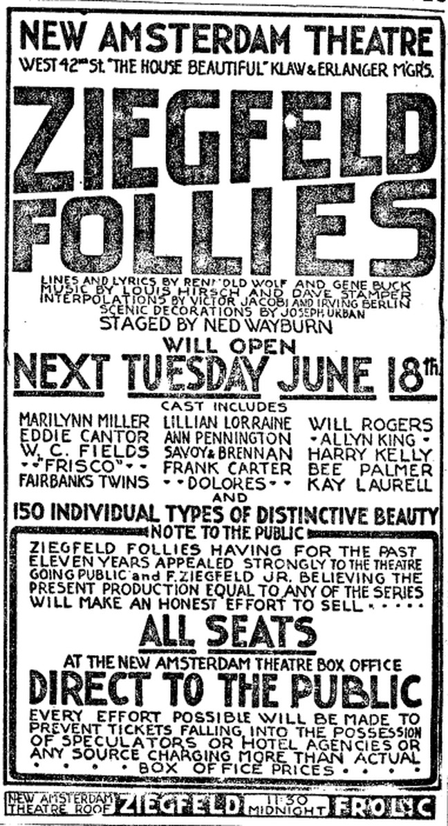 Will Rogers, W.C. Fields ,Eddie Cantor, Marilynn Miller, Ann Pennington, Lillian Lorraine and the Fairbanks Twins shared the stage along with a slew of other great acts and celebrities that are completely forgotten today. You will note Florenz Ziegfeld was not too fond of ticket brokers and scalpers.