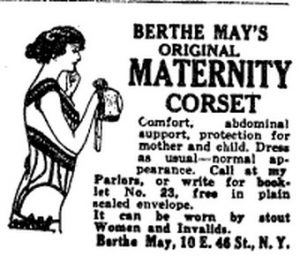 The final item is this advertisement. Corsets as you may know could be very confining and uncomfortable for women. At least from the illustration this doesn’t look like as bad as it sounds. When you were expecting you weren’t supposed to “show.” But were women so addicted to wearing their corsets, that they would need one even when they were pregnant!??