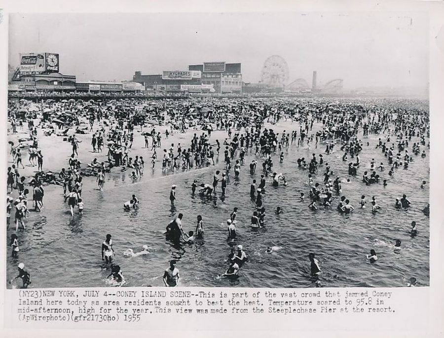 New York – July 4 – Coney Island Scene – This is part of the vast crowd that jammed Coney Island here today as area residents sought to beat the heat. Temperature soared to 95.8 in mid-afternoon, high for the year. This view was made from the Steeplechase Pier at the resort (AP Wirephoto) – 1955