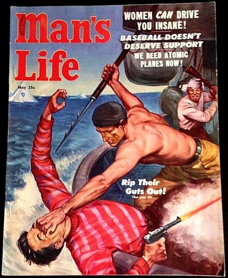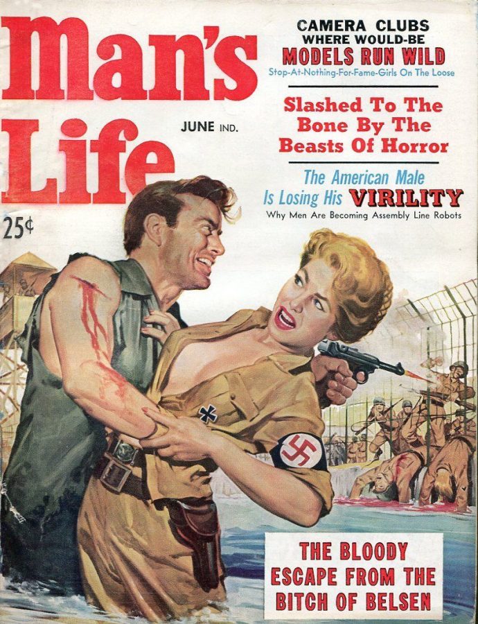 Growing up in the 1950s, my trips to the barber meant catching up my Man’s Life, and similar magazines, reading. Always had those beautiful blonde buxom Nazis to deal deal with and rampaging animals of all sorts. Also got to enjoy Police Gazette, Argosy, True Crime, or if I was lucky, a well worn second-rate girlie magazine with half the pictures ripped out.