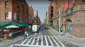 The street light is beautifully ornate, as is another one about 100 feet behind it. The wagon on the right side of the street has wire keeping some live produce from escaping. Behind the man and woman with the basket there is is a fire alarm. An Italian shop occupies the corner at 71 Mulberry Street. The large brick building on the right is Public School 23.