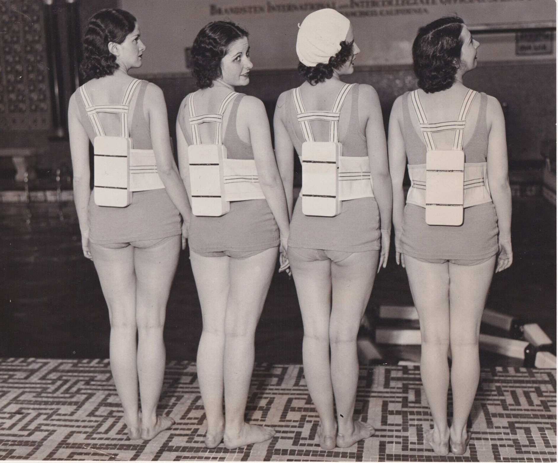 New York – These lucky buoys are embracing the quartet of pretty maidens who assisted at the tests of a new life preserver at the Park Central Hotel pool today (Tuesday.) The device is said to be of one third the weight and three times the buoyancy of the present cork life vests. The belts are the invention of Jesse W. Reno, well known engineer who also invented the modern escalator or moving stairway. The girls are, left to right: Dorothy Day, Pat Hughes, Prudence Edgar and Sherry Pelham. photo: International News Photos 5-3-1932