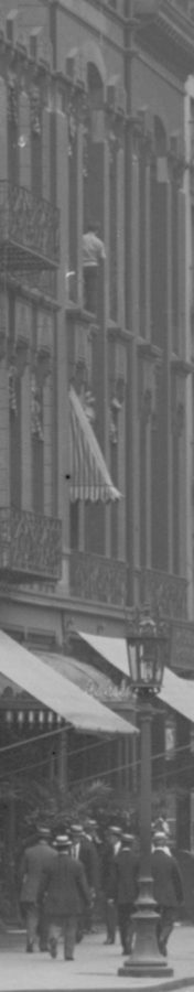 One of the things that remains the same today is advertising on buildings. Here several signs compete for attention. Above White’s Restaurant are Brown & Jacobs, tailors. They advertise that they are looking for “first class coat makers.” Cohen’s typewriter agency is here if you need to buy or rent a typewriter.