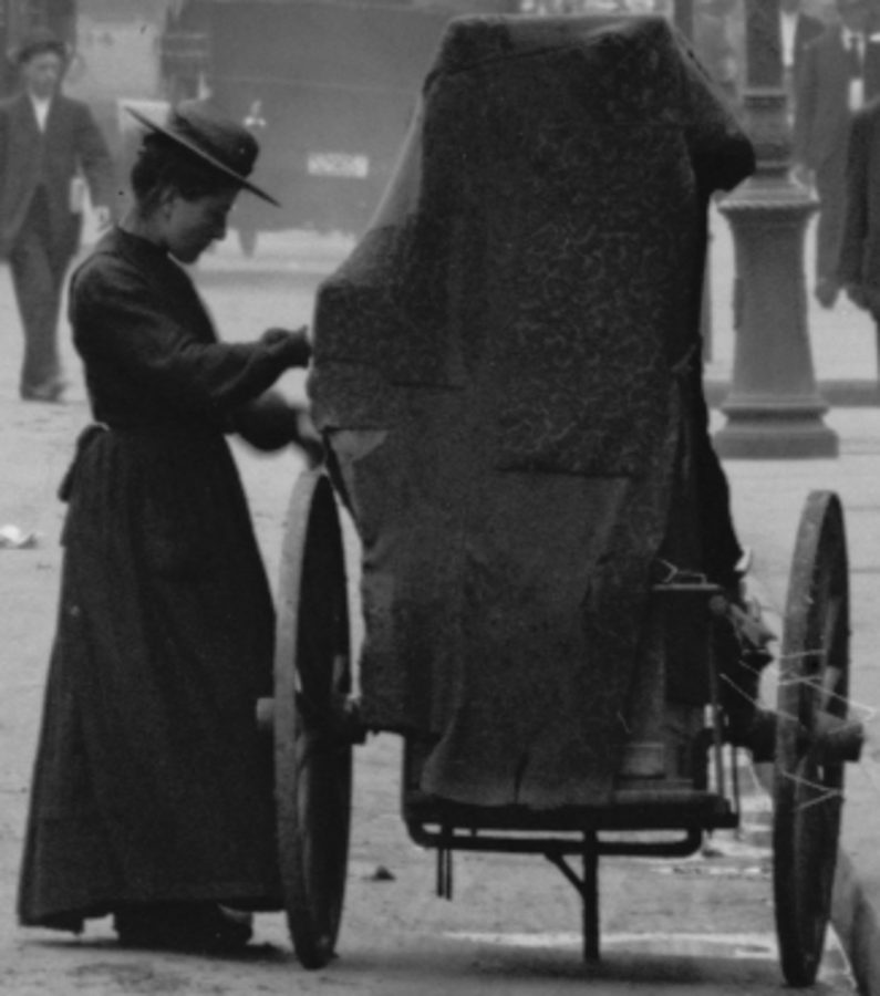 One unsolvable mystery: what is under the tarp on the delivery cart this woman is examining? Could it be a piano?