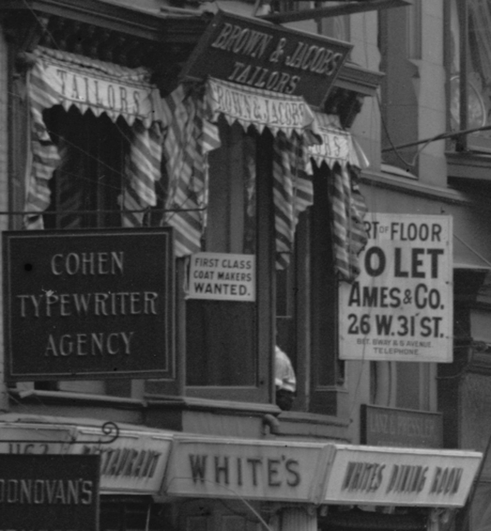 One of the things that remains the same today is advertising on buildings. Here several signs compete for attention. Above White’s Restaurant are Brown & Jacobs, tailors. They advertise that they are looking for “first class coat makers.” Cohen’s typewriter agency is here if you need to buy or rent a typewriter.