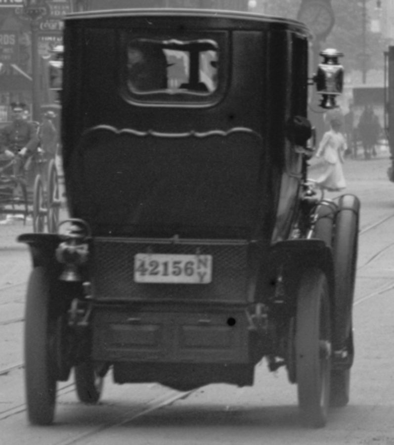 An automobile with license plate 42156 heads down Broadway. Though the car may not be brand new, the license number indicates the plate is from about 1906. You had to beware when crossing the streets. There were no stop signs or traffic signals.