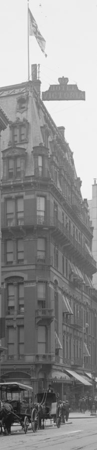 On the left is the eight story Hotel Victoria stretching from Broadway to Fifth Avenue along 27th Street. President Grover Cleveland would use the Victoria as his headquarters whenever he was visiting the city. The hotel began operations in 1872 and was razed in 1914.