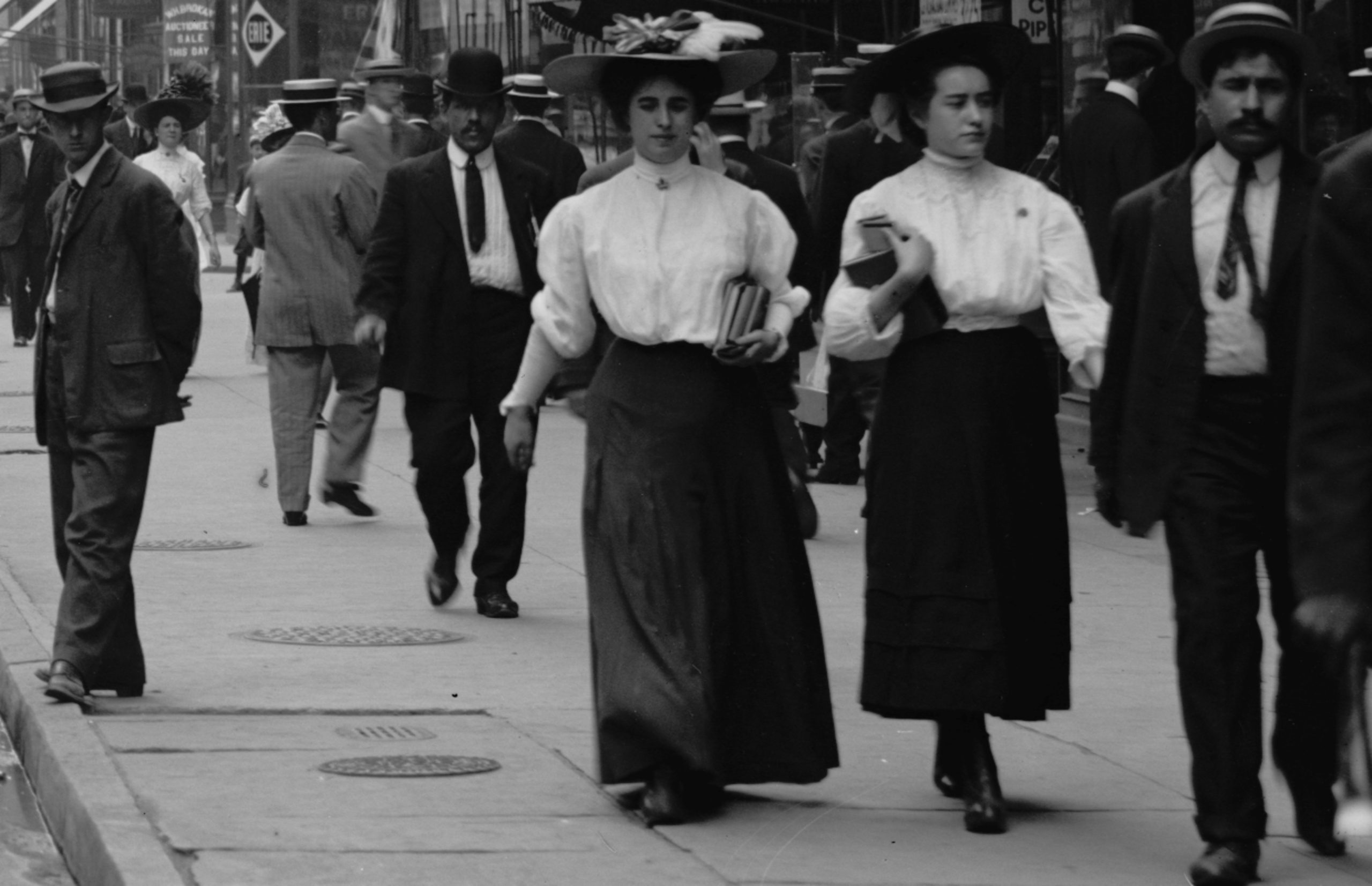 Most pedestrians take little notice of the photographer who was capturing this scene. Instead, the man on the left pays attention to the two women in light shirts carrying books. As fashion of the day indicates, nearly everyone is wearing a hat.