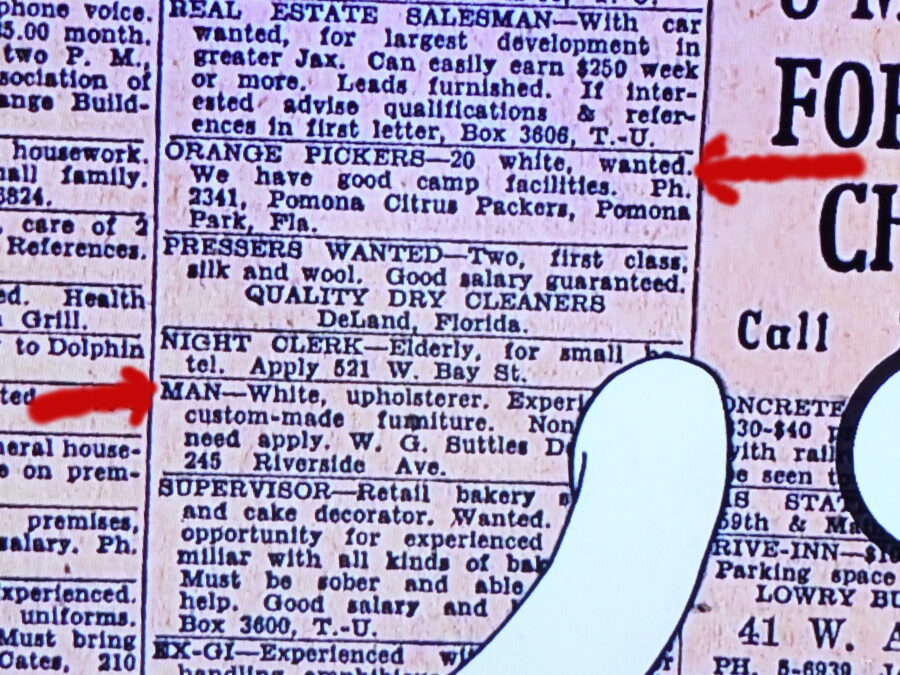 One says “Orange Pickers – 20 white wanted”. The other says “Man – White, upholsterer.”