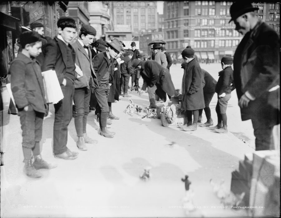We see pedestrians going about their business as horse drawn vehicles make their way up and down Broadway. Parking does not seem to pose a problem and a wagon advertising “hams” is making a delivery on the west side of Broadway. Bowling Green’s original 1771 fence is visible in the foreground.